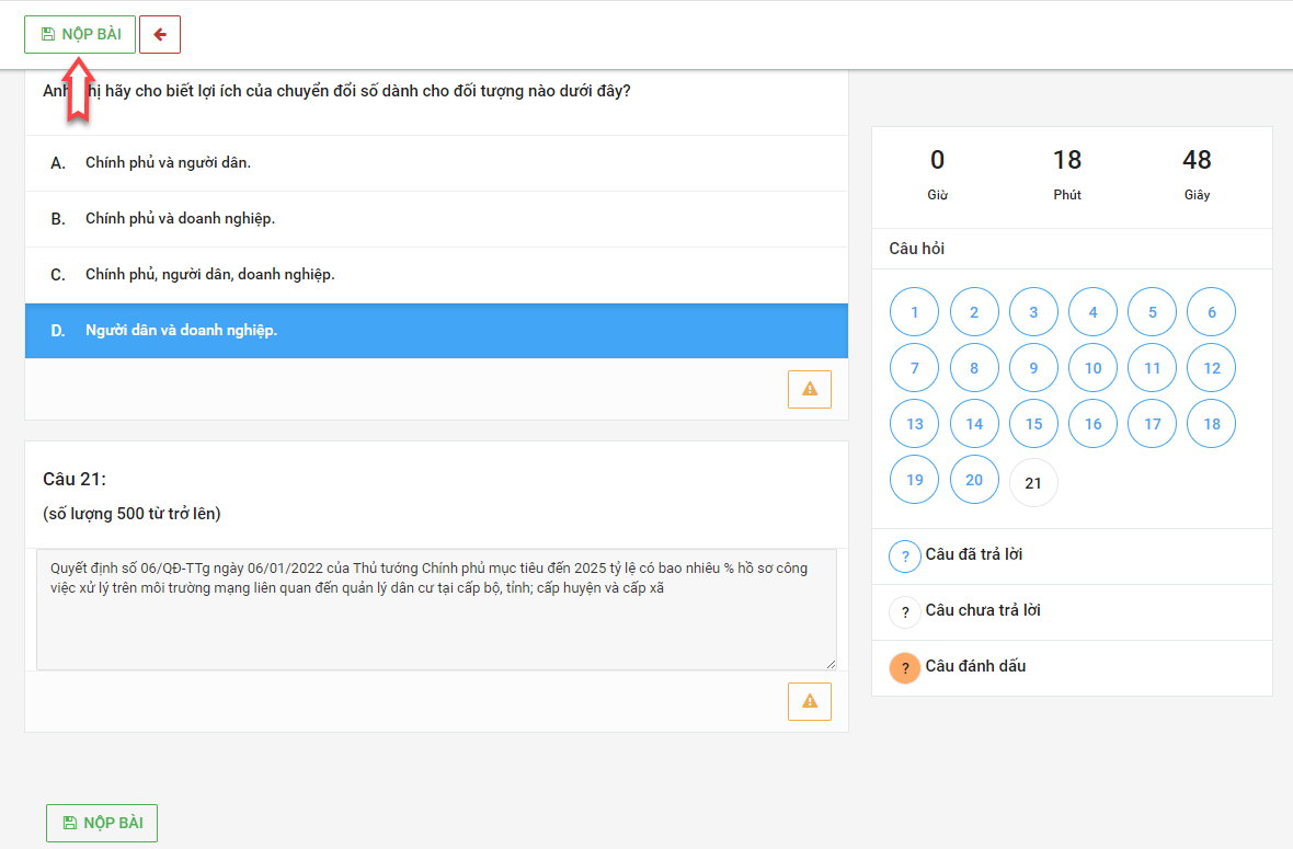 Sau khi hoàn thành bài thi, người dùng bấm vào ô “NỘP BÀI”.