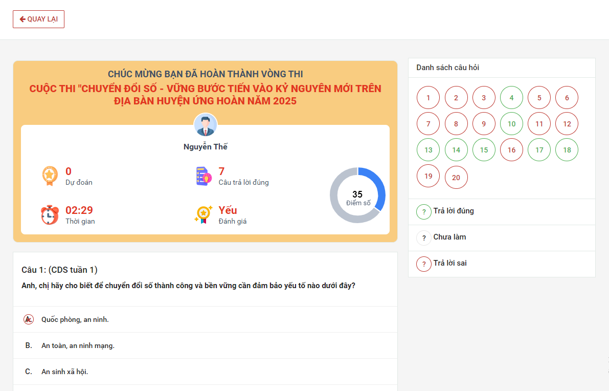 + Từ câu 1 đến câu 20, người dùng chọn đáp án đúng.